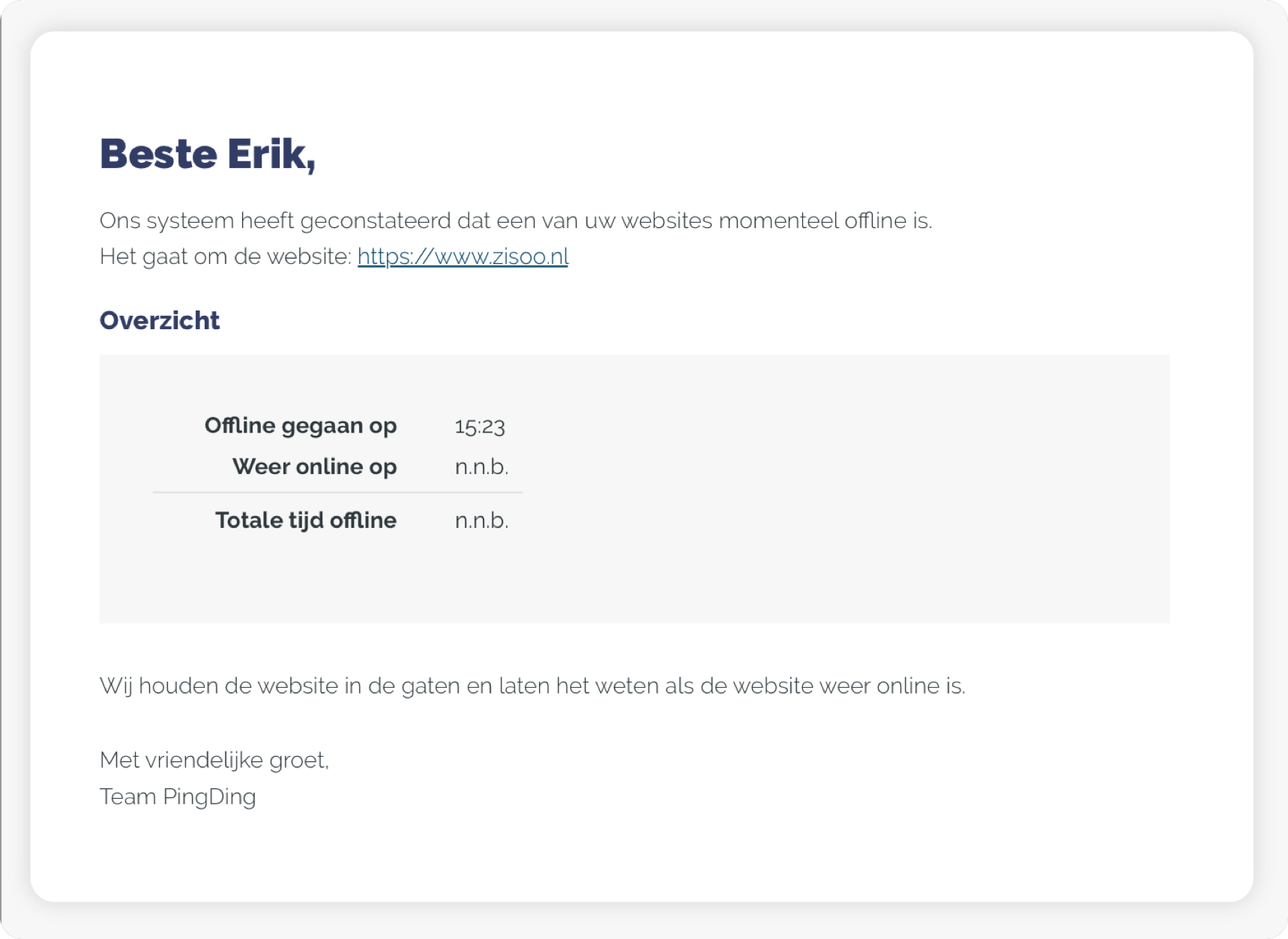 Wil je altijd weten of je website of server bereikbaar is? PingDing monitoort het! 24x7x365. Als je webapplicatie offline is dan ontvang je een SMS of een e-mail. Je bent direct op de hoogte van de status van je wesbite of server en je kan meteen actie ondernemen. Tevens krijg je bericht als je SSL certificaat bijna afloopt, zo voorkom je een onveilige website!